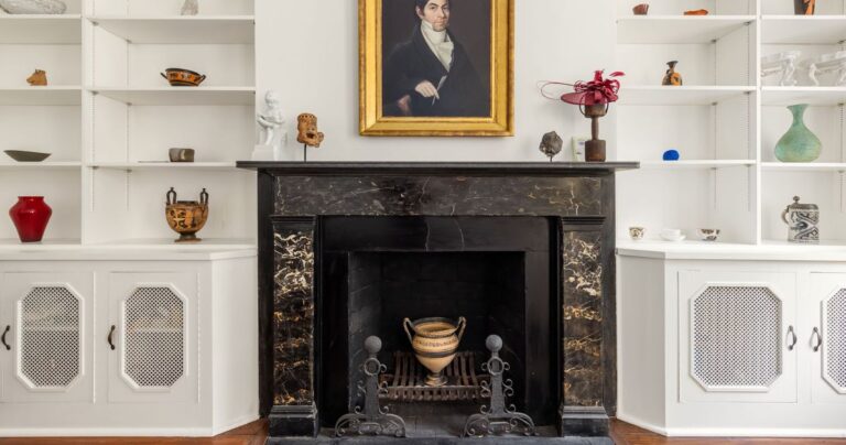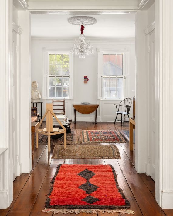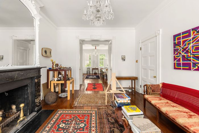 The couple’s focus has been on the objects inside. “The idea of mentioning a stager to them would be so horrifying,” joked Mason, their broker. “The house itself is an object and a piece of art in a way, where you experience and see things differently.” An early Tony Smith painting in blue, black, and gold over a fireplace in the primary bedroom echoes the black-and-gold blocks in an 1880 jacquard textile laid over the bed. The riot of color in a 1959 Alfred Jensen painting is reflected in a rococo mirror. On the second-floor landing, a rug by Navajo artisans rests next to the sharp feet of a Federal table under a Josef Albers print of New Mexico — a kind of diorama about colonialism, made from stuff the family already happened to own. “We’re both visually committed, and our things need to have energy as well as meaning,” said Berssenbrugge. “Like many collectors who are married, we find that the depth of the conversation is a rich part of life.”