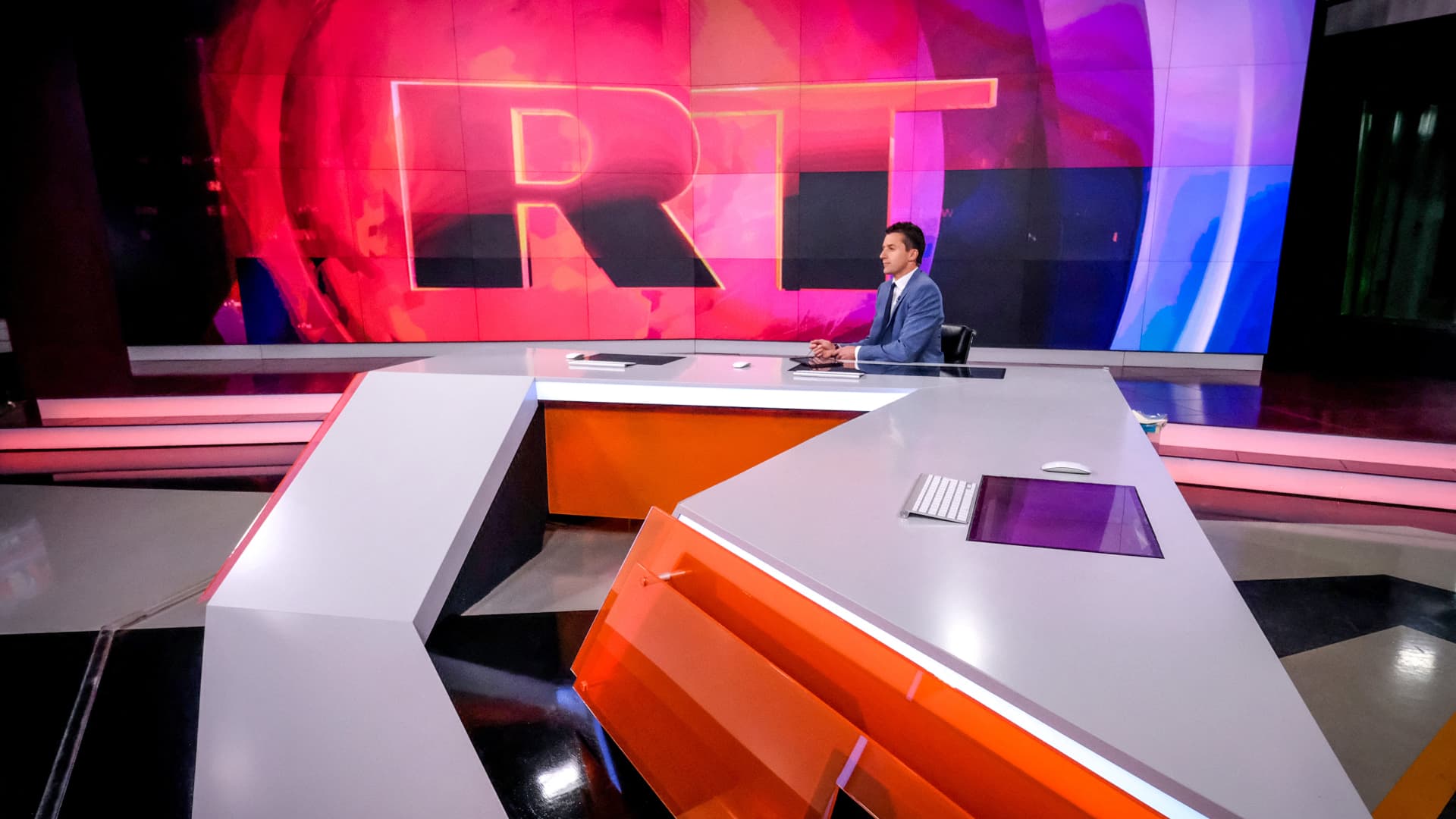 An unidentified Russia Today anchor prepares to go on the air in the RT TV studio in Moscow, June 8, 2018.