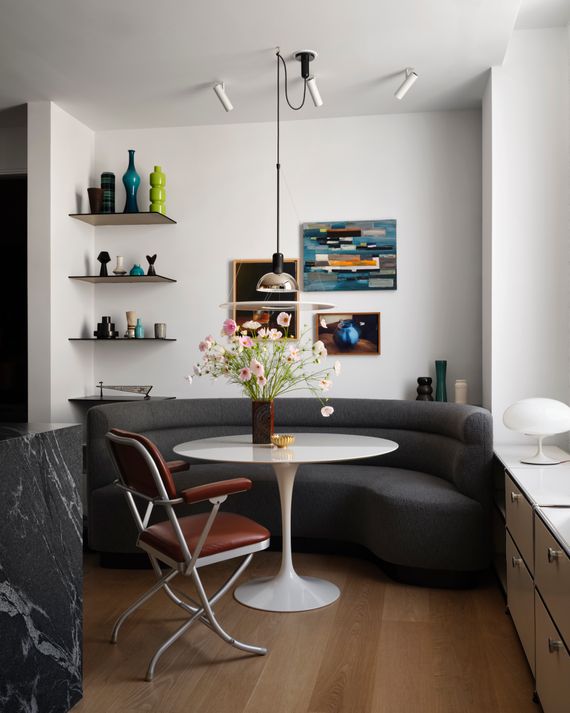 “I built a banquette for them,” Paredes says of the breakfast area in the kitchen, “and those little shelves to the left were Yuval’s idea. I built the banquette based on a drawing that we did.”