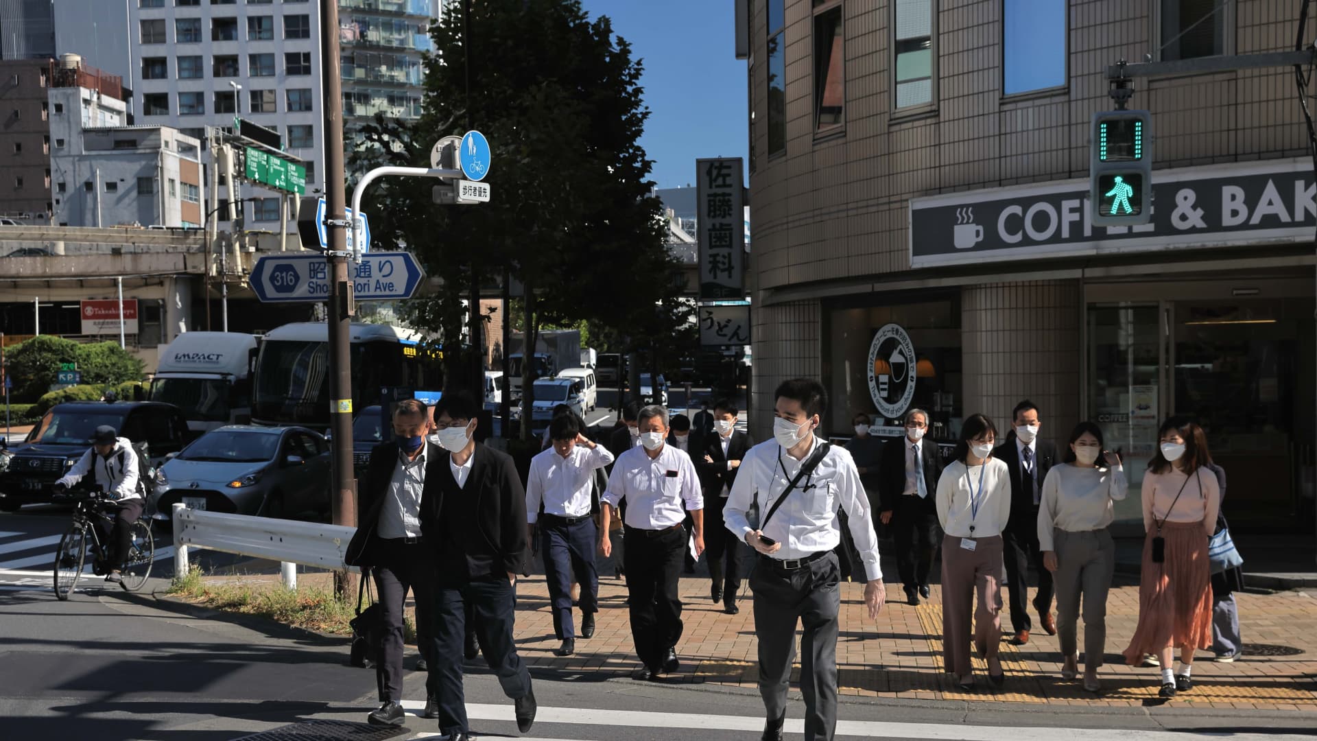 Office workers cross the street at lunch time near Tokyo Station on Oct. 20, 2022.