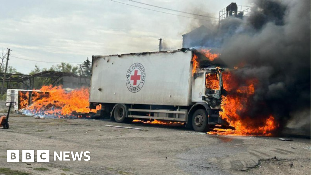 In a post on social media, Ukraine’s leader blamed a Russian strike. Zelensky shared a photo of a white truck in flames branded with the Red Cross logo on its side.