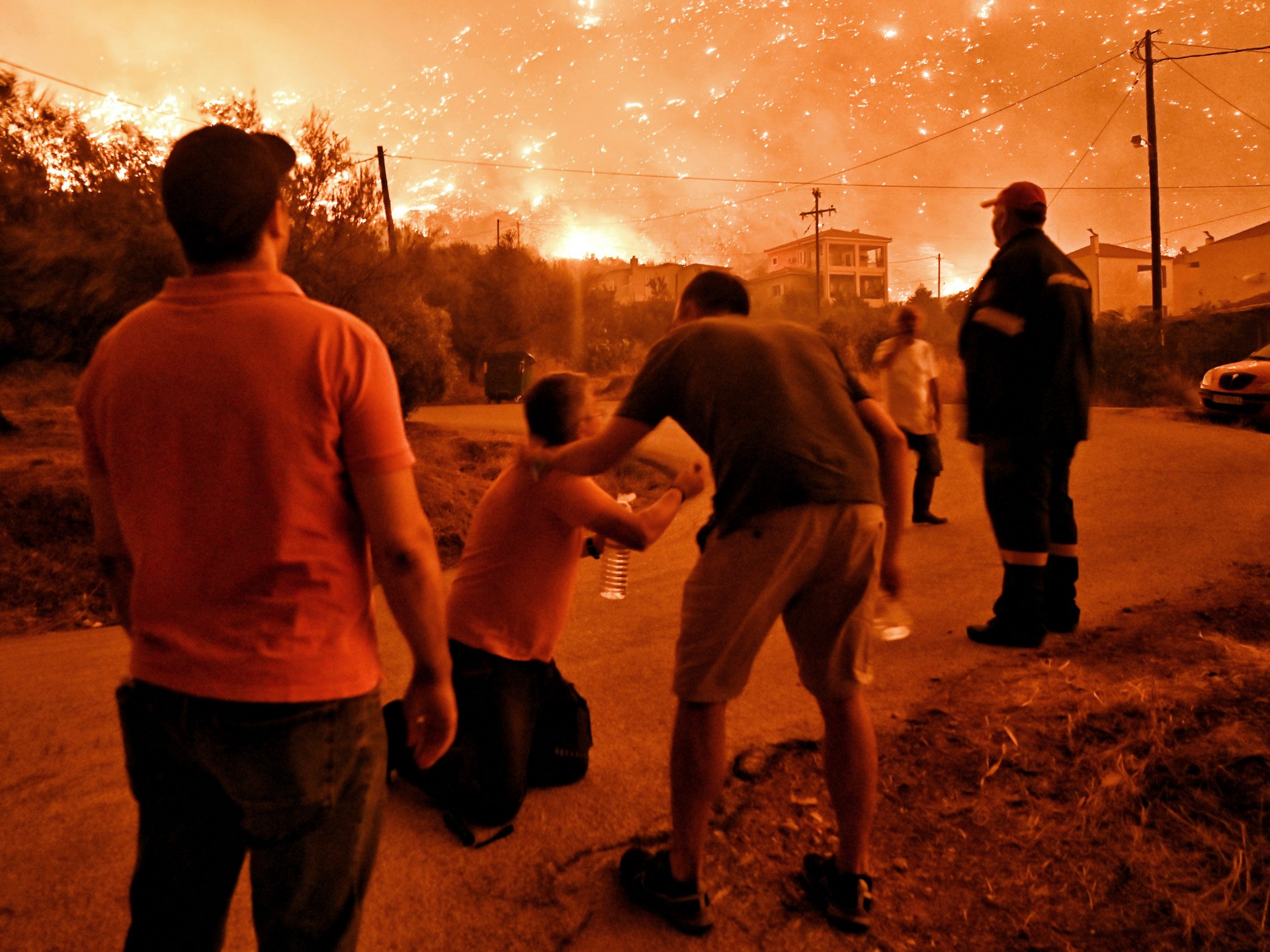 Two people have died in a rugged mountainous area in central Greece while trying to help firefighters tackle a forest fire that has forced several villages to be evacuated, authorities have said.
