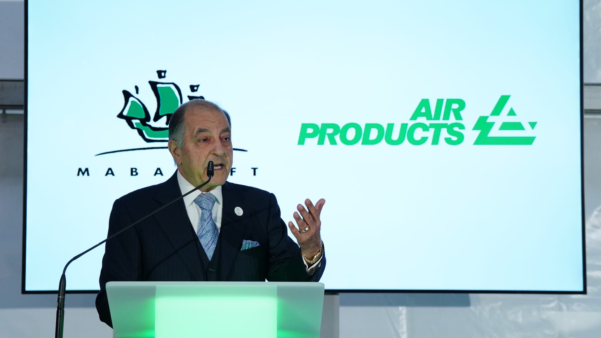 Seifi Ghasemi, president and chief executive officer of Air Products, speaks during a press event to announce the construction of a green energy import terminal at the Oiltanking Deutschland GmbH tank terminal site in the port.