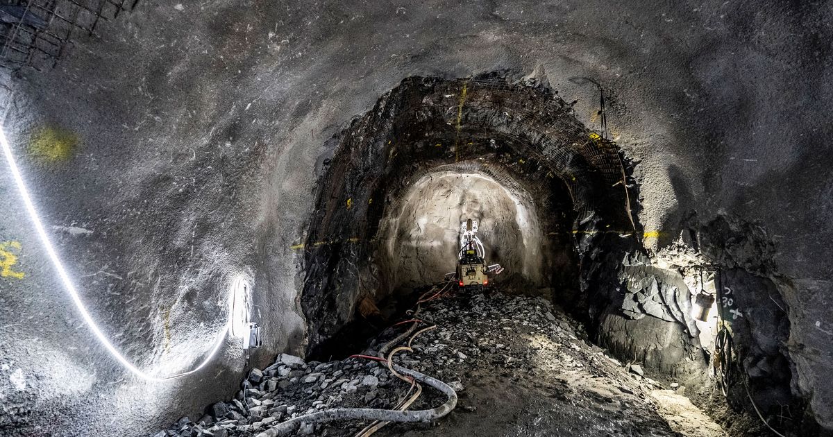 A steel sleeve lines the tunnel, and its inner surface is layered with rebar and sprayed-on concrete.