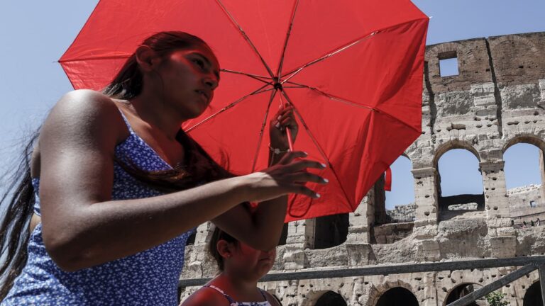 A woman uses an umbrella to protect herself from the sun as she passes past the Colosseum during an intensely hot day in Rome, Italy, on July 11, 2024.