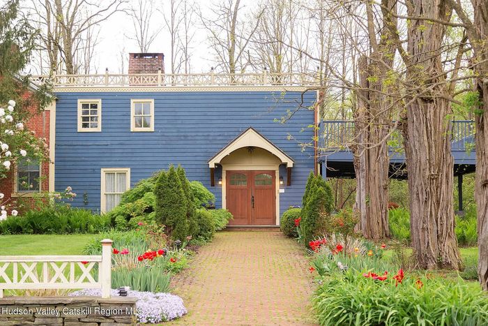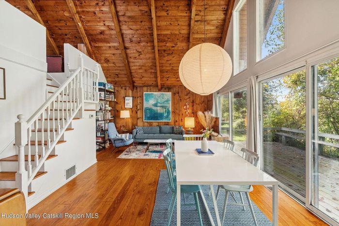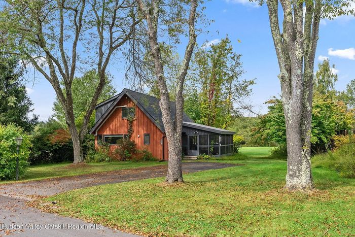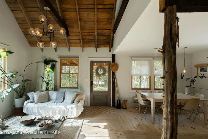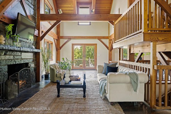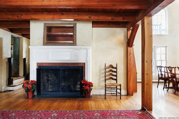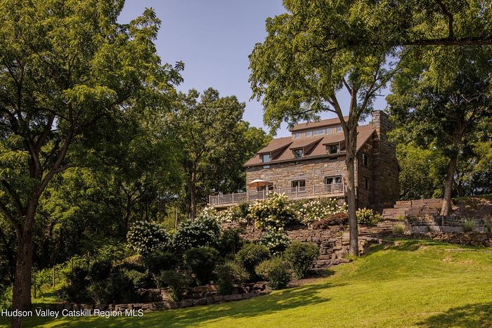 The post-and-beam house featured in this listing photo sits on a hill overlooking the Hudson River.