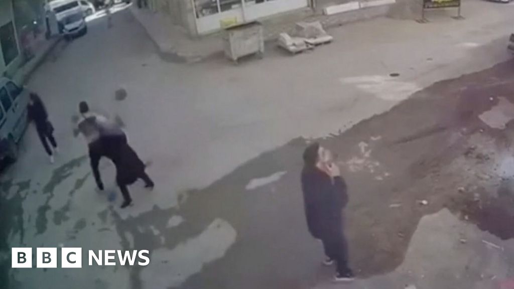 Falling debris narrowly missed a group of people in a street in eastern Turkey, after it was hit by an earthquake.