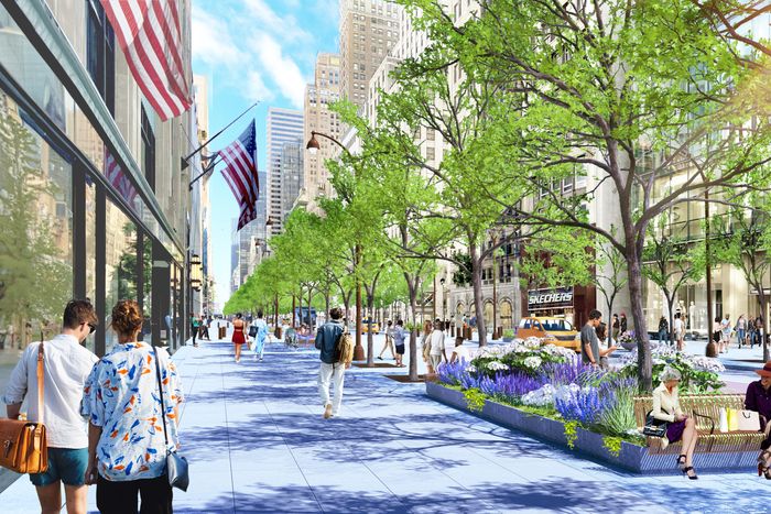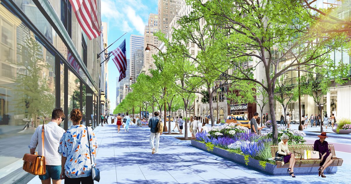 Just weeks after announcing a plan (or at least the preparative study of a plan) to reconstruct Park Avenue in its premodern, superior form, the city has just revealed a major makeover for Fifth. Essentially, it has had to rule among all those conflicting needs and demands, and its excellent decision has been to give a lot of the space over to walking people rather than moving vehicles. From the bottom of Central Park down to 42nd Street, five lanes will become three, one of them given over to buses. The sidewalks will approximately double in width, with another band of space given over to tree pits, supplying a blessed bit of shade. There will be places to sit and planters. Construction is to begin in 2028.