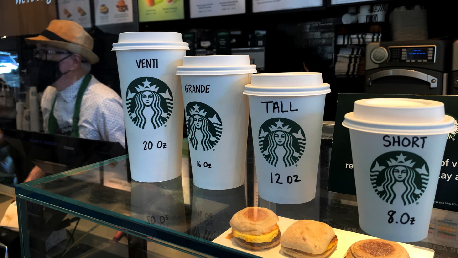 Starbucks cups are pictured on a counter in Manhattan, New York, on Feb. 16, 2022.