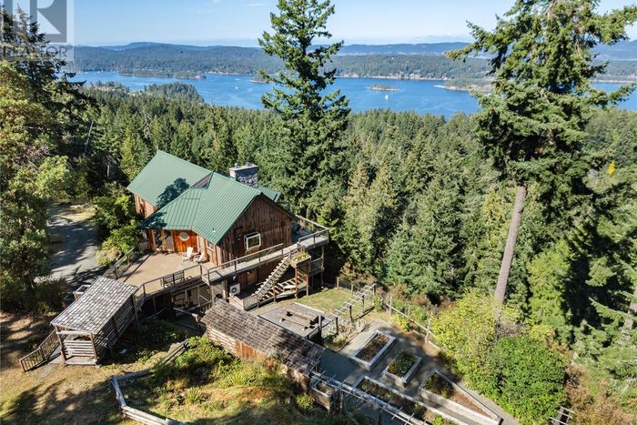 The aerial listing photo shows off the wraparound deck, patio, and raised vegetable garden.