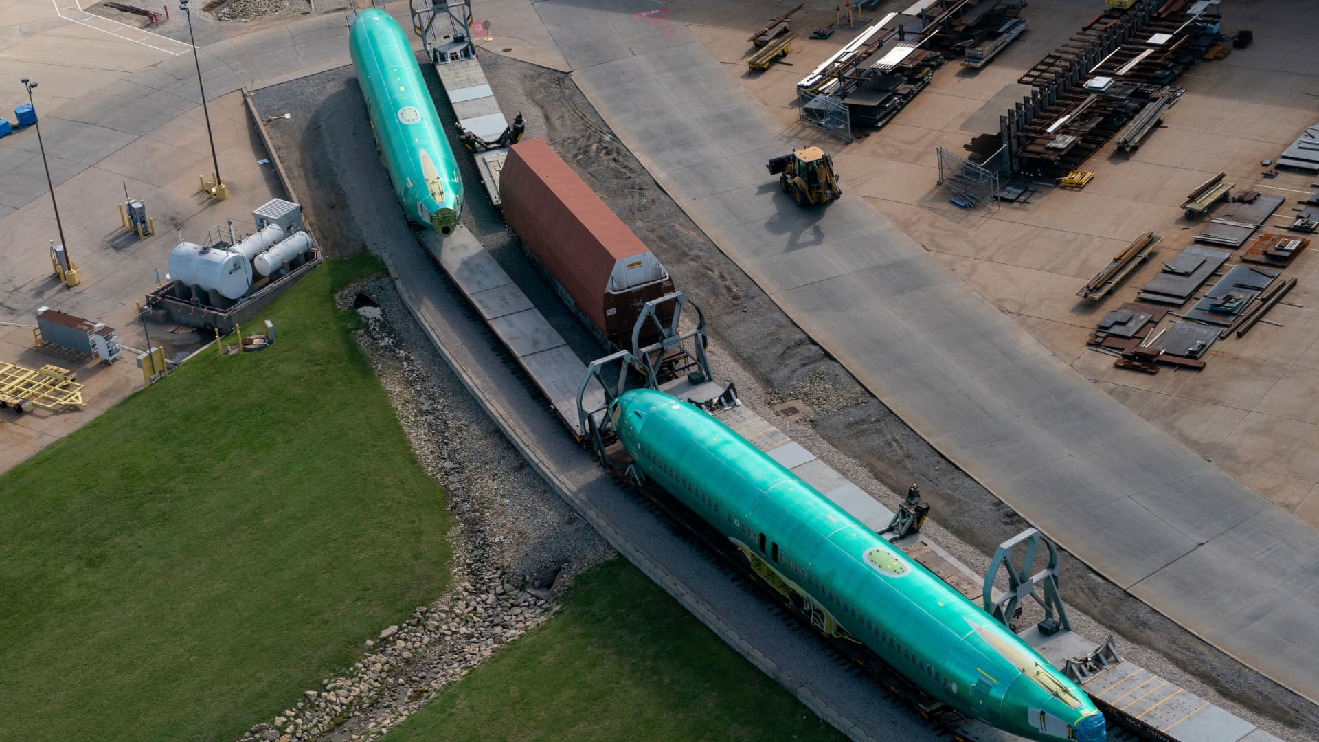 Boeing 737 fuselages on railcars at Spirit AeroSystems’ factory in Wichita, Kansas, on July 1, 2024.