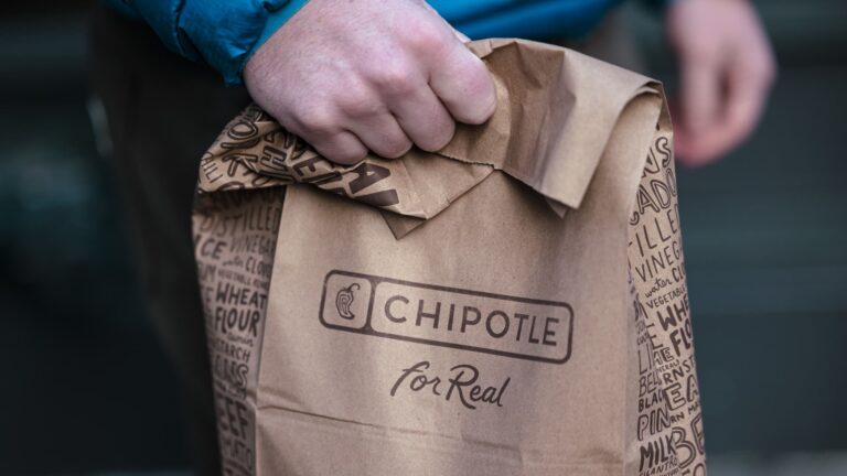A customer holds a bag of food outside of a Chipotle restaurant in New York on Jan. 12, 2024.