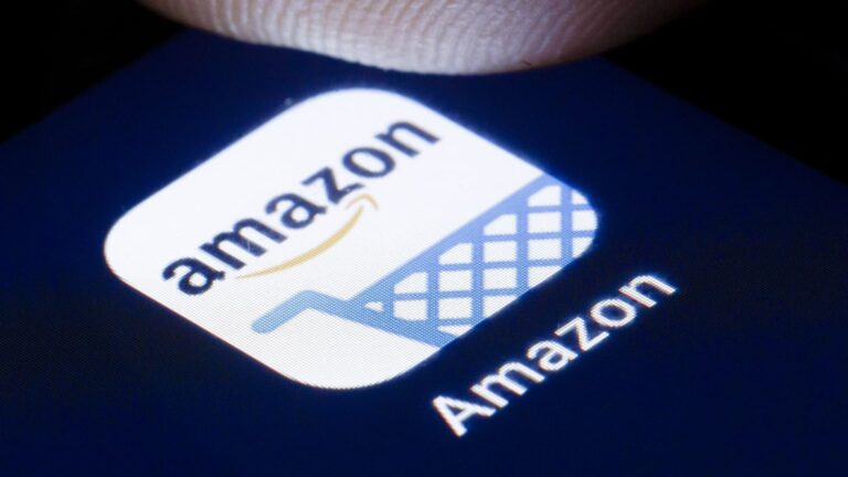 The logo of the online retailer Amazon is shown on the display of a smartphone.