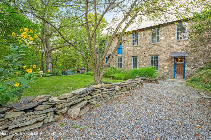 The former stone church has stone pathways and wild gardens as shown in this listing photo.