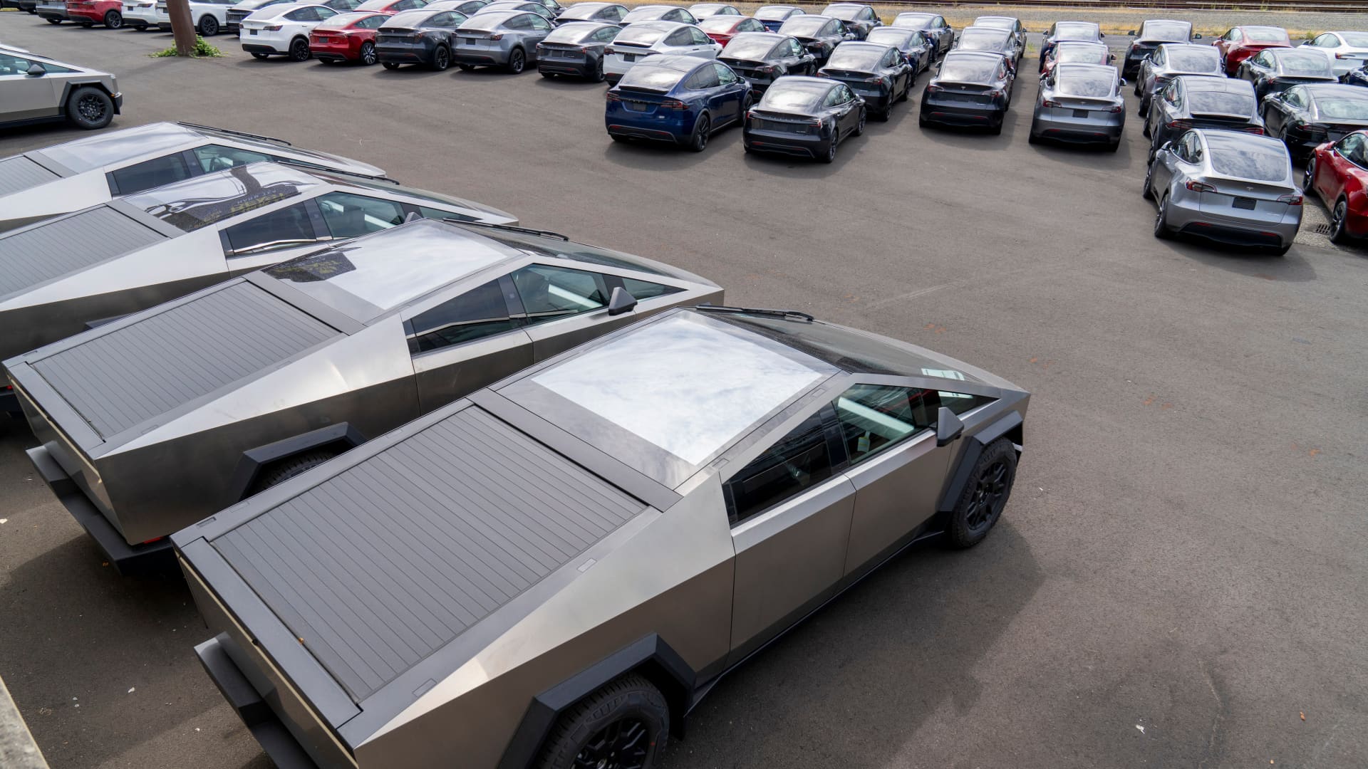 New Tesla Cybertruck vehicles parked at a logistics drop zone in Seattle on Aug. 22, 2024.