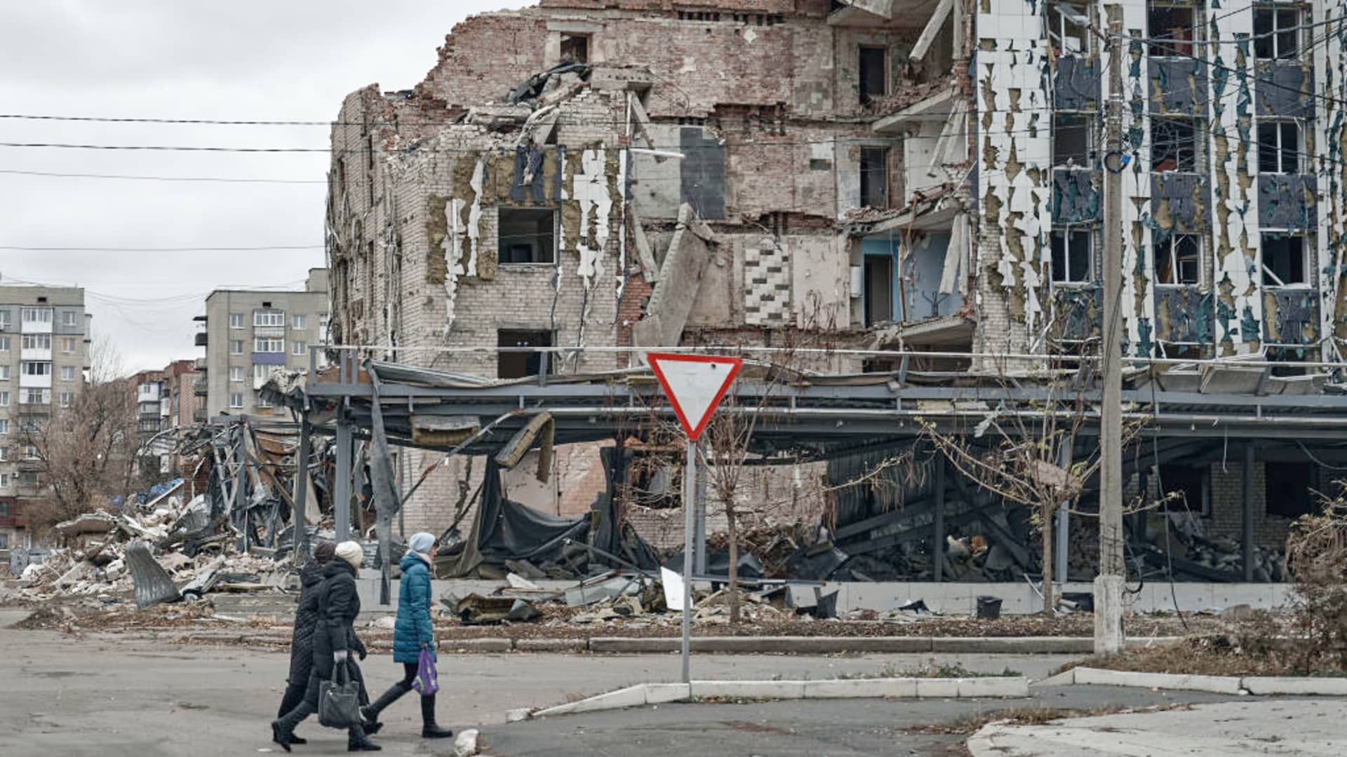 Local residents walk past destroyed houses in the city, approximately 10 km from the frontline, on November 16, 2024 in Pokrovsk, Ukraine.