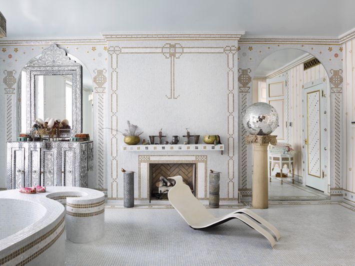 The Main Bathroom: “I love paisley, so I knew I wanted a paisley-shaped tub,” says Reiss. The Bouloum lounge chair is by Olivier Mourgue. The Mexican pool tiles are mixed in with objects she scavenged from different decorative elements in the house. “I also endlessly bought little mirror tiles on Amazon.”
