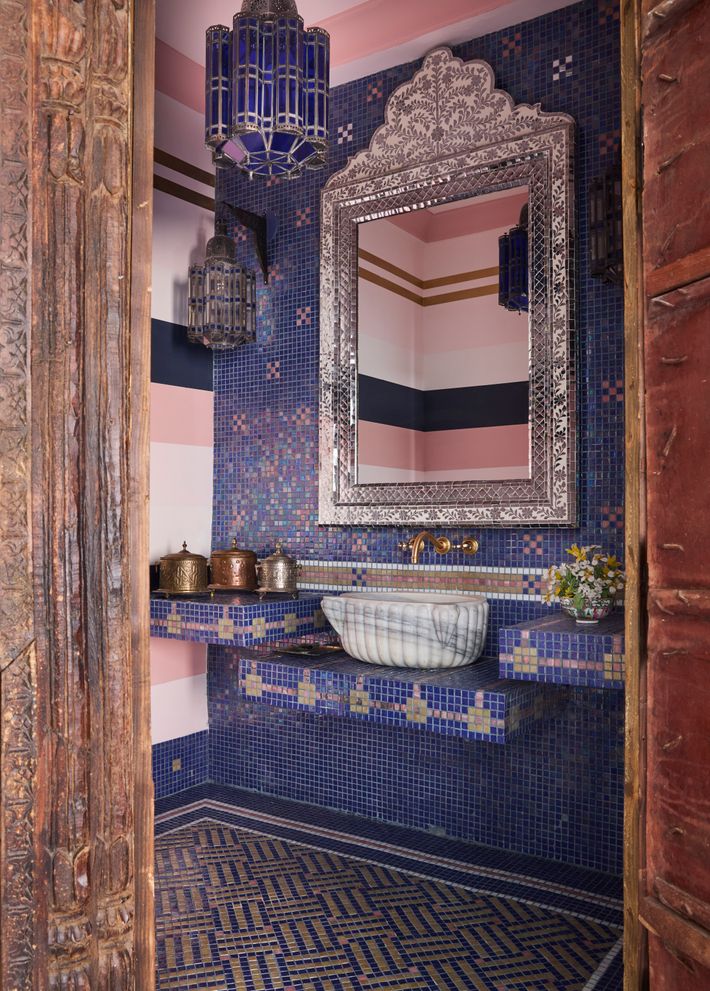 The primary bathroom includes a room with another combination of custom Mexican pool tiles made into mosaics. “One of my favorite color combinations is pink and navy,” Reiss says. “This is a Turkish marble sink from a hammam, from about 1850.” The striped wall is painted.