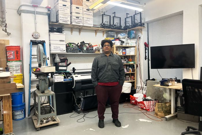 Andrew Ross in his subsidized studio. Behind him is a large-format printer and, above it, four 3-D printers that he plans to move into storage while working out of a home studio.