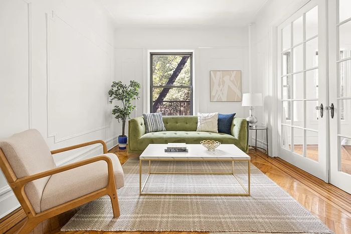 The living room featured in this Gramercy Park listing photo opens up to 17th Street, a landmarked block.