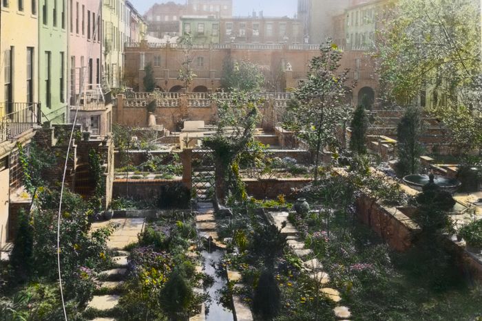 An image of the gardens taken around the time they were completed. Individual walled gardens behind each townhouse open to a central shared garden.
